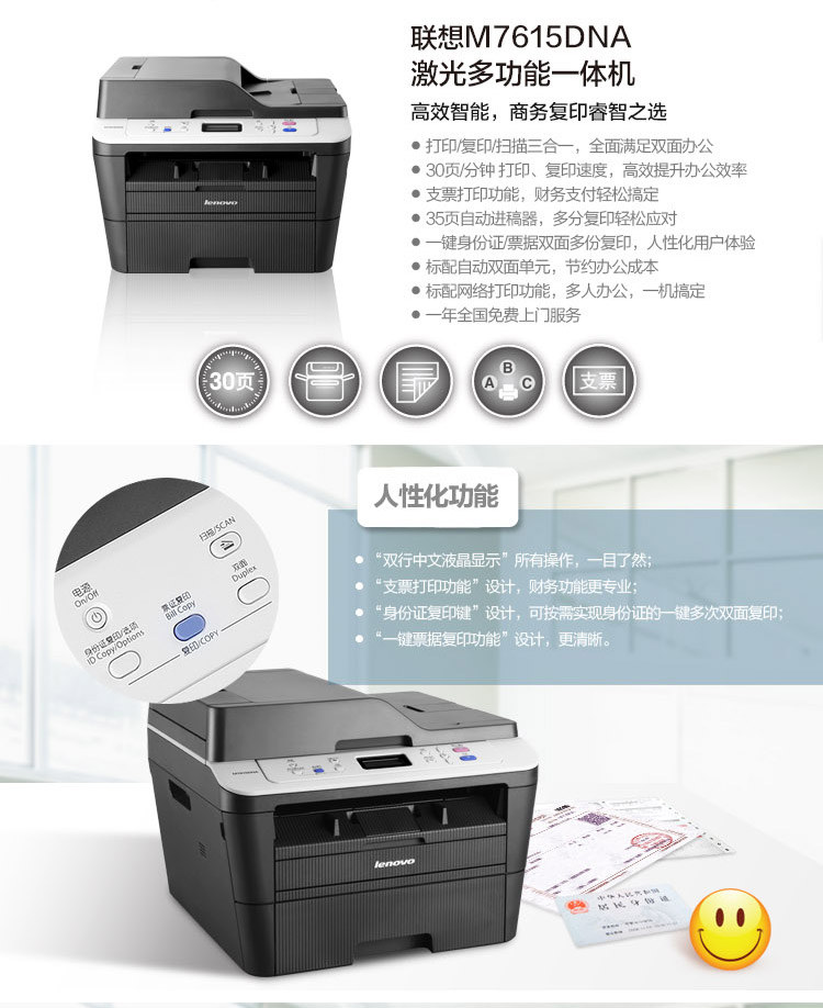 支持打印/复印/扫描三合一,满足双面办公,30页/分钟